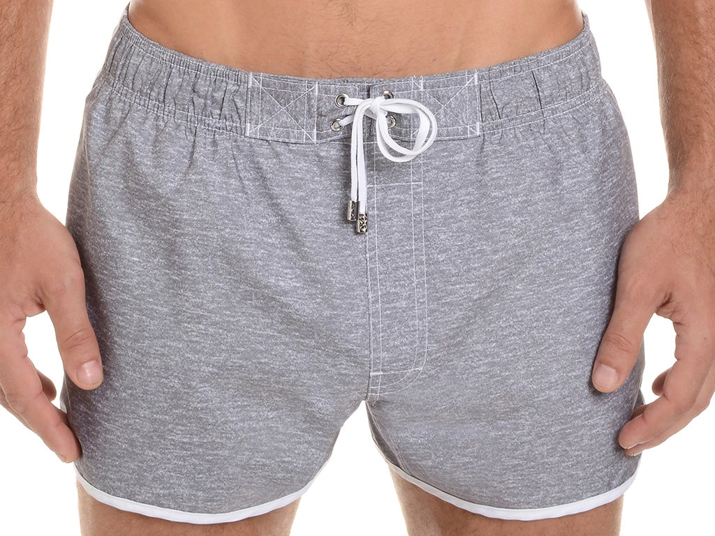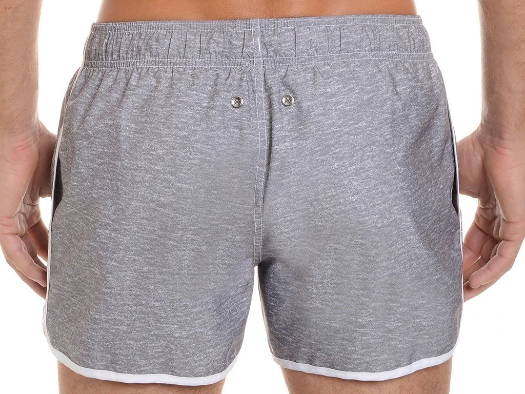 A trim-fitting Swim Short with a solid-colored body, retro dolphin split at the side hem, and accent contrast taping around the borders Quick-Dry Mesh Interior Liner, Functional, deep side-entry pockets