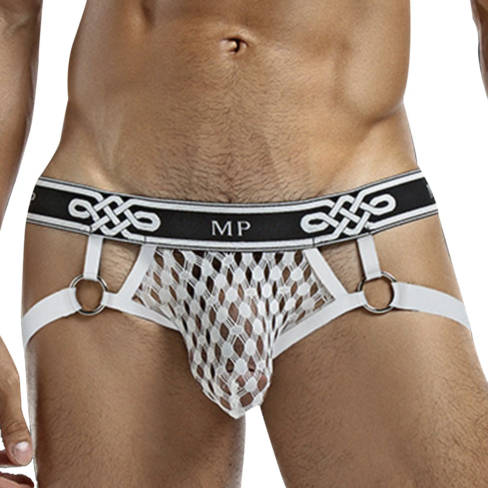Ring jock with plush elastic leg bands attached to decorative metal rings, new plush MP branded waistband.