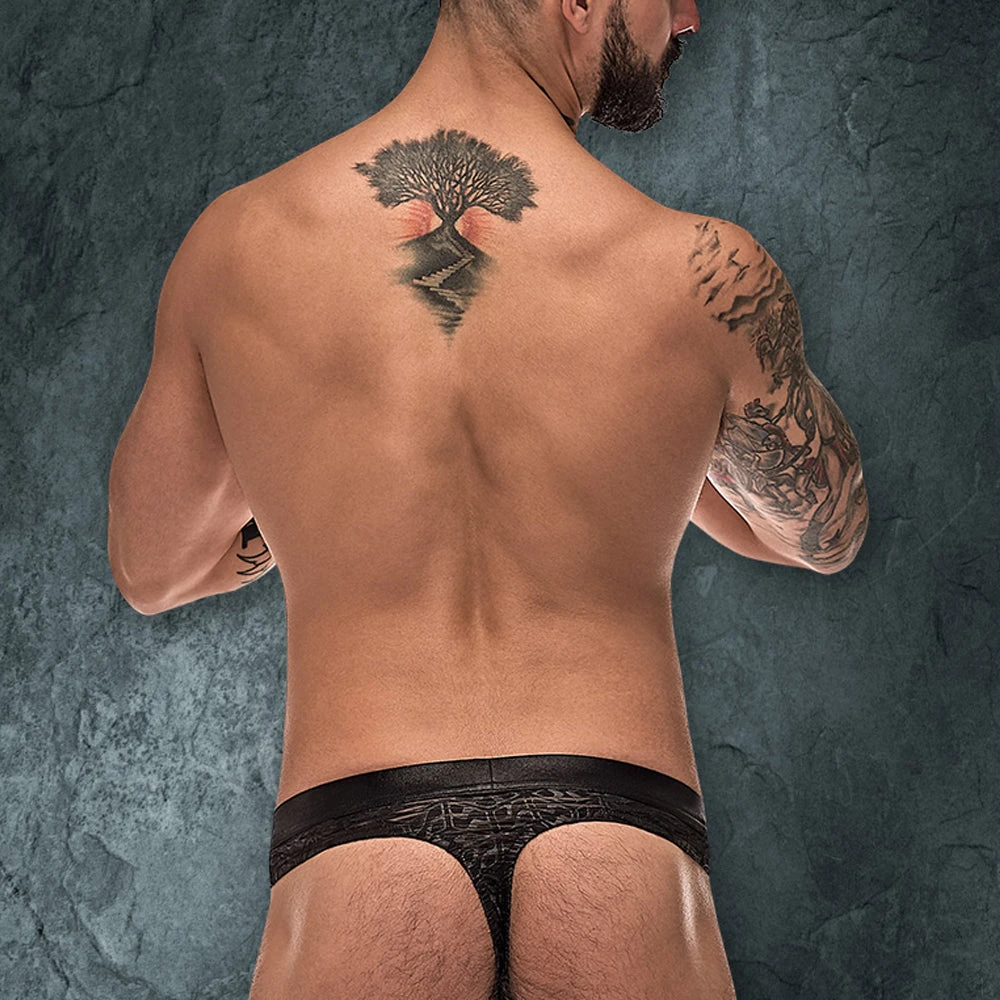 From the Zip It collection by Male Power, this style includes: a thong featuring a contoured pouch with a diagonal pouch zipper with a protective flat and a slimming, wet-look waistband. Semi Sheer burnout fabric with a tone on tone abstract pattern. Lightweight and breathable with all way stretch. . 95% Polyester 5% Spandex. Hand wash, cold. No bleach. Line dry.