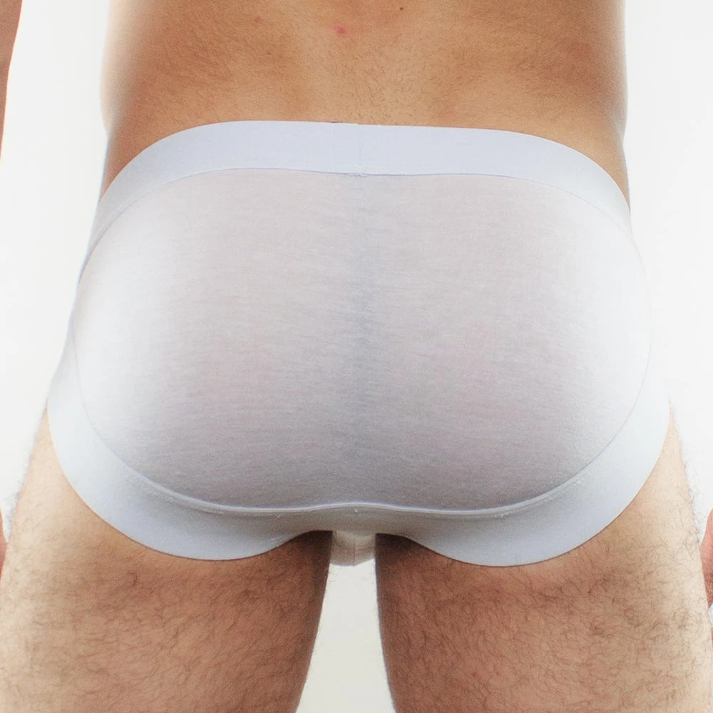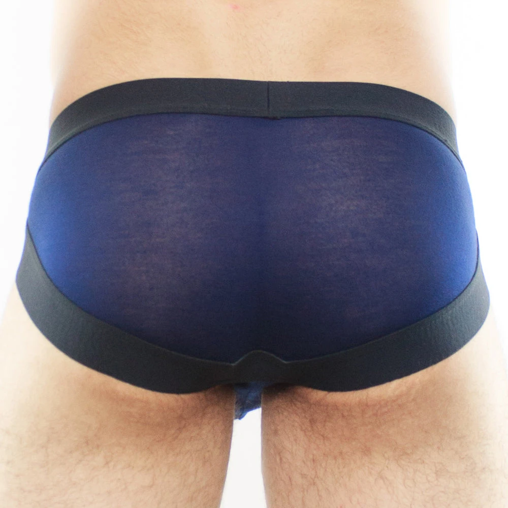 - Sheer men’s brief underwear fabric in the front with conventional coverage in the back