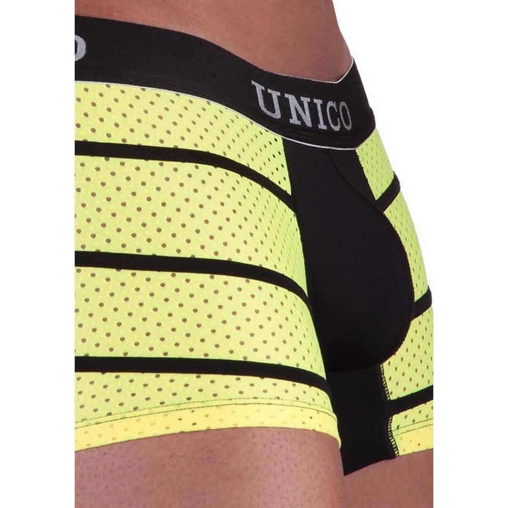 Unico’s Tecnico Trunk comes in five great color choices: red, blue, green, orange, and yellow. Each vibrant color is paired with a solid black pouch front and rear paneling while the front of the legs feature mesh details for added comfort and breathability. A great choice to add a pop of color into your underwear drawer!